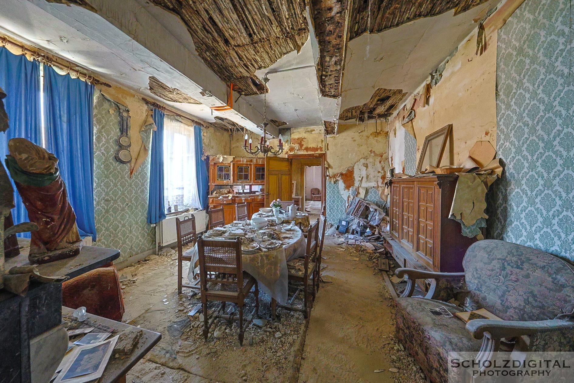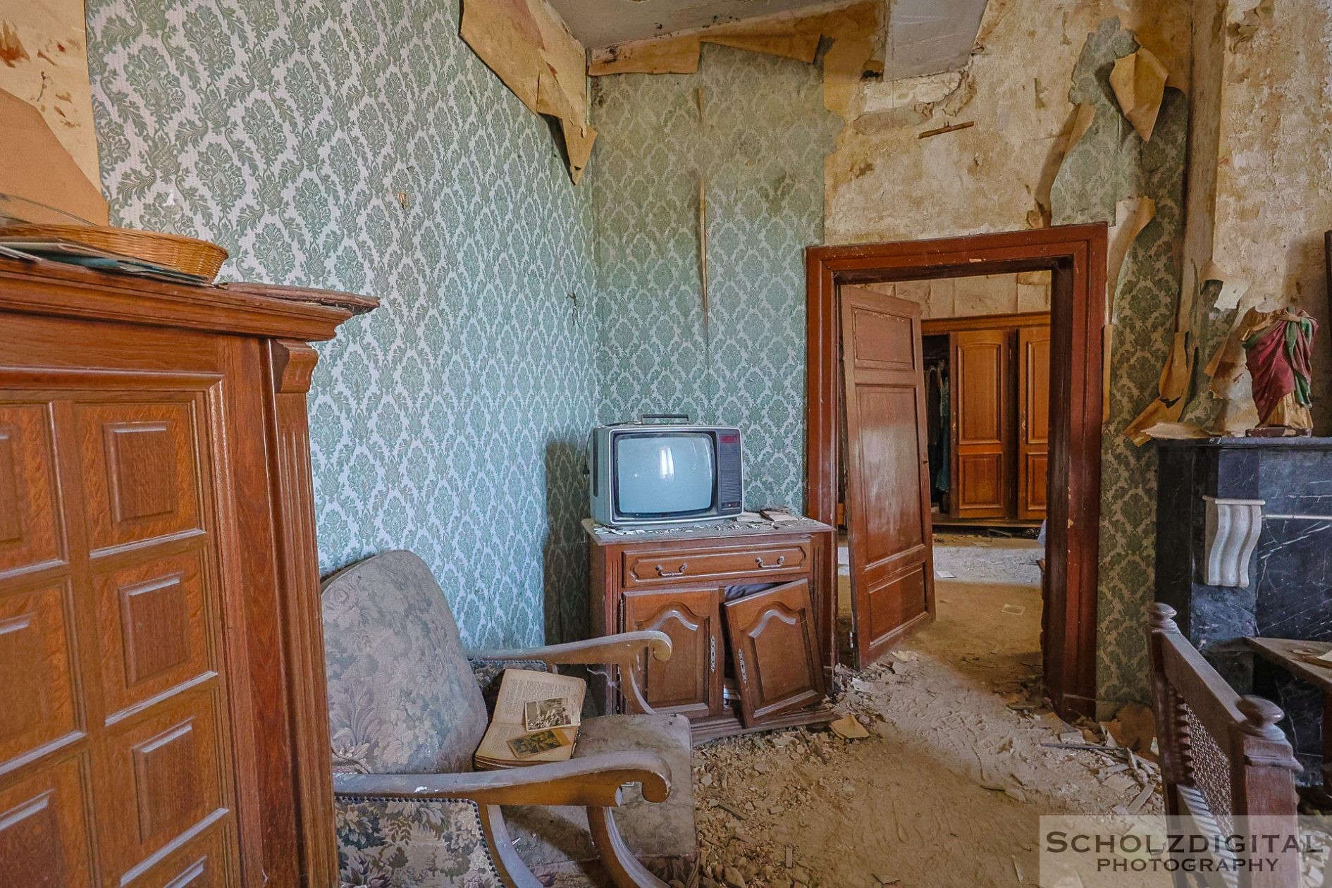 Diese Szene – die Madonna im Flur, das Licht, das durch die kaputten Scheiben fällt – verleiht dem Ort eine fast symbolische Ruhe. Zwischen all dem Verfall wirkt sie wie ein stiller Zeuge vergangener Zeiten.