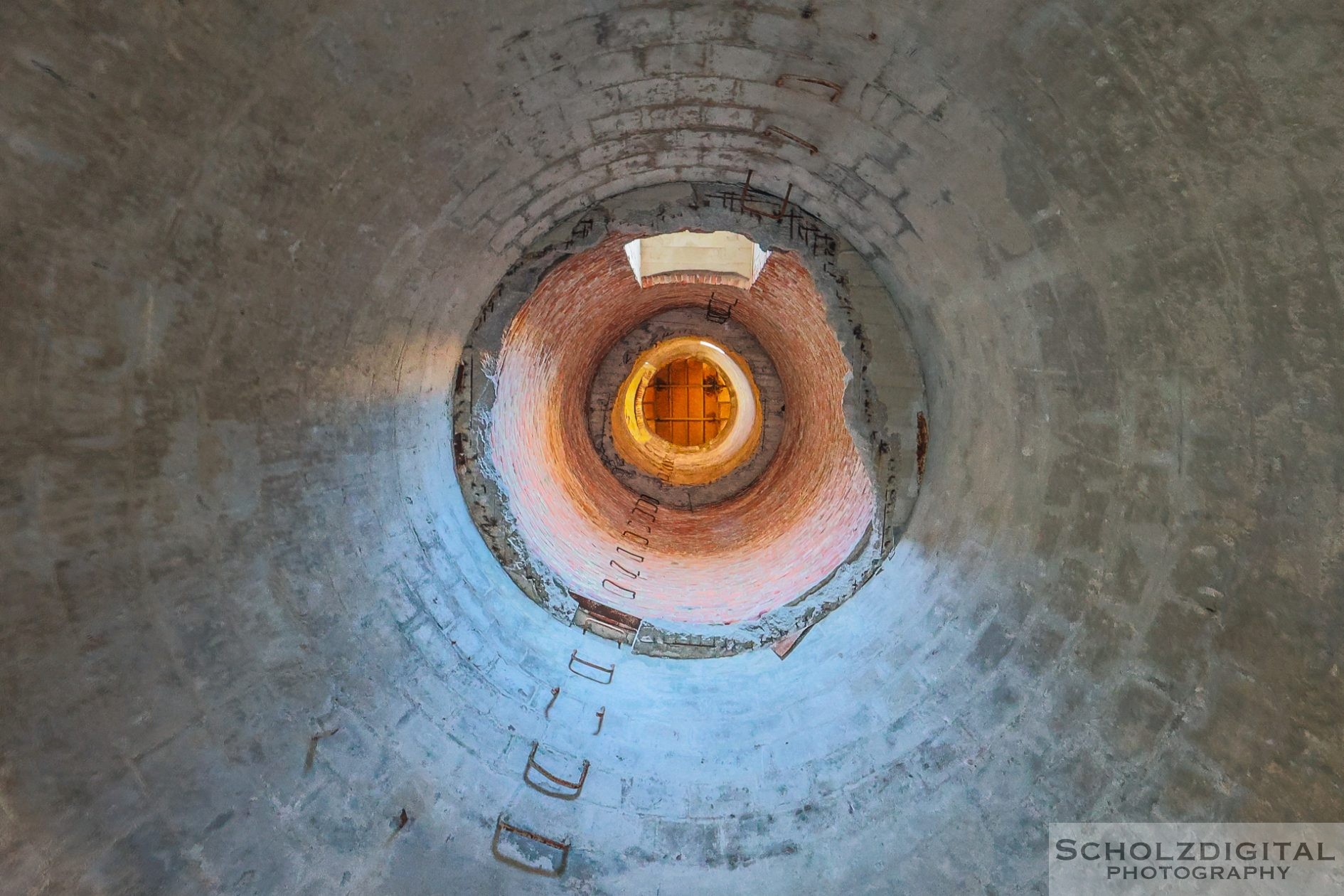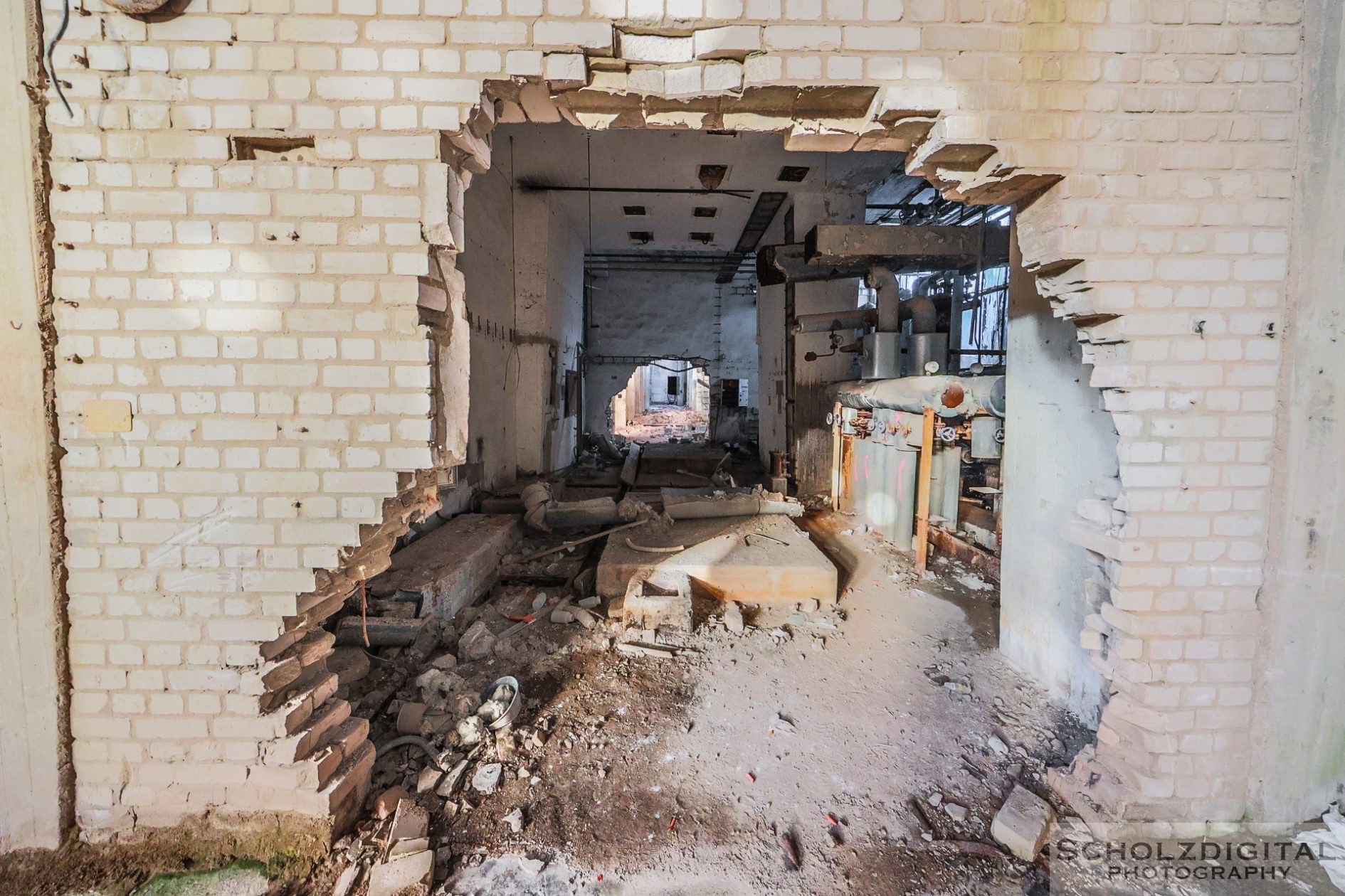 Der erste Blick fällt auf die gigantischen Hallen mit den endlos langen Korridoren, durchbrochen vom Spiel aus Licht und Schatten. Sonnenstrahlen brechen durch zerbrochene Fensterscheiben, treffen auf alte Maschinen, Rohre und tonnenschwere Stahlträger.